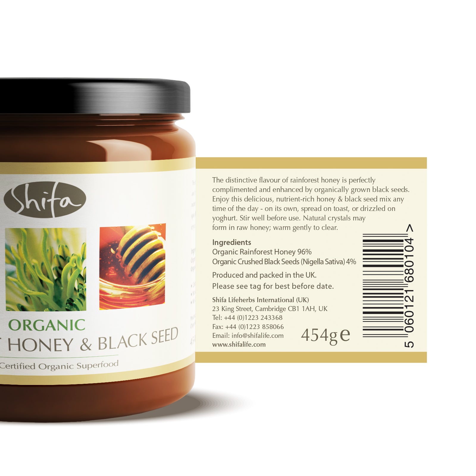 Organic Rainforest Honey 96%, Organic Crushed Black Seeds (Nigella Sativa) 4%.